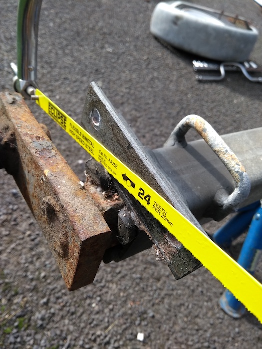 I had intended to use an angle grider but a new hacksaw blade worked fine, has less risk of damage to other parts, and I needed the exercise. It took about 10 minutes per side.