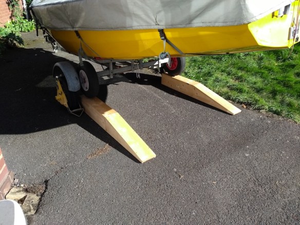 I’ve also made a couple of simple chocks to stop the road trailer rolling towards the launch trolley. Altogether it is now easy and low-stress to get the trolley on and off the trailer.