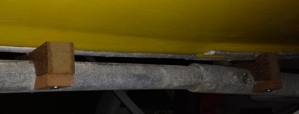 Commercial boat trailer blocks were the wrong size, so I decided to use some iroko offcuts. Iroko is a hardwood that is very tough and weather resistant – ideal for this application. It is probably a bit harder than a rubber block but I don’t think that is significant in this application – the load is taken on the keel protection strips.
