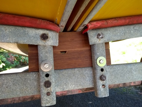 The hardest bit was cutting out the existing plastic tube while the boat was on the trolley. I’m happy with the result – the boat will now rock very slightly from side to side as recommended on the Wayfarer and Wanderer websites. I’ve also inserted more iroko supports between the trolley and keel so the boat is now correctly supported.