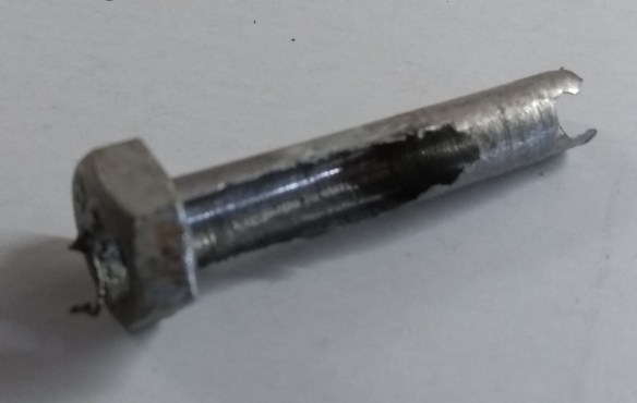I started the hole with a centre drill, then followed up with a 4mm drill, then 5.5mm. The 5.5mm drill produced lots of ‘wire’ as the bolt thread disintegrated.