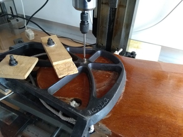 That’s pretty accurate; however the drill appears to have bent slightly towards the centre of the bolt. The threaded end of the bolt has completely disappeared without any damage to the hole in the rudder stock.Unfortunately there is a bit of damage to the rudder stock at the head-end of the bolt. That doesn’t matter too much as I’m going to bush the holes with acetal, but I’d prefer accuracy!