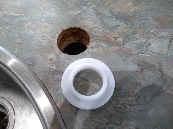 The main issue was that the hole in the worktop is too big for the new tap – the edge of the tap would only overlap the hole by about 1mm. Not enough. So I made an adapter from acetal/Delrin.