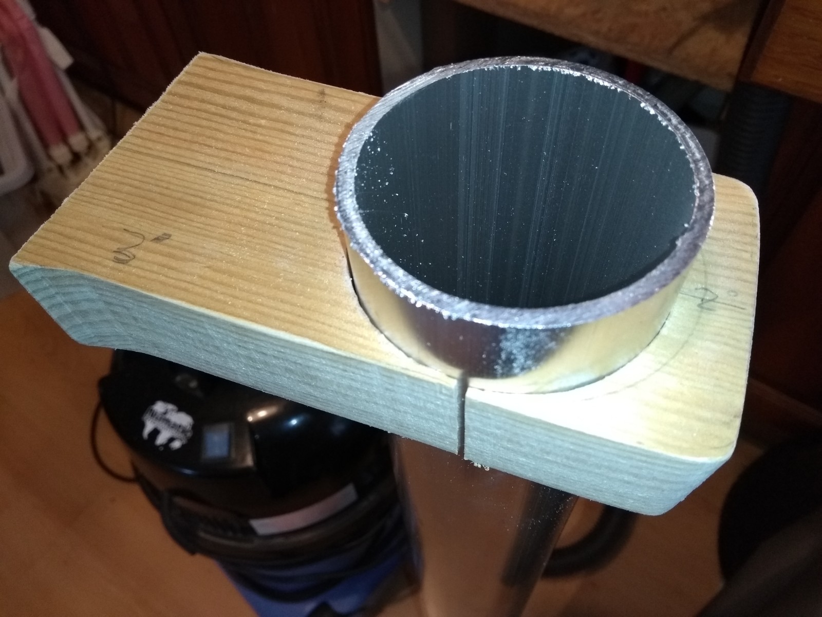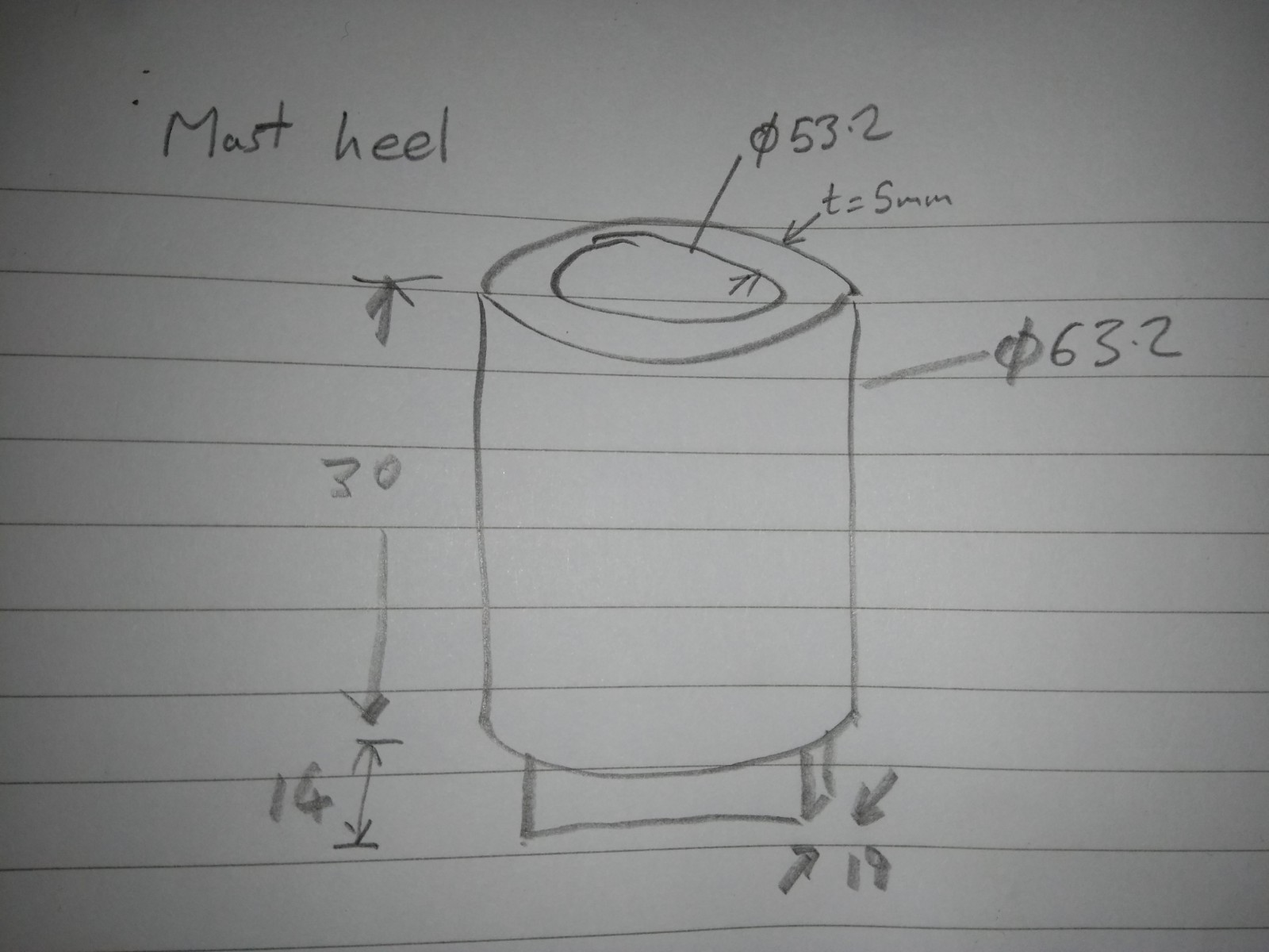 I’ve got a lump of aluminium (again from EBay) that I’ll machine down to this shape. It won’t be exactly this shape as I need to allow for the mast to pivot on its tabernacle pin as it is raised. Ideally the heel fitting bottom should be curved to allow for this. I might curve it on a belt sander or just machine it with a chamfer on both sides. The diameter of 63.2mm is the measured internal size of the main mast tube.