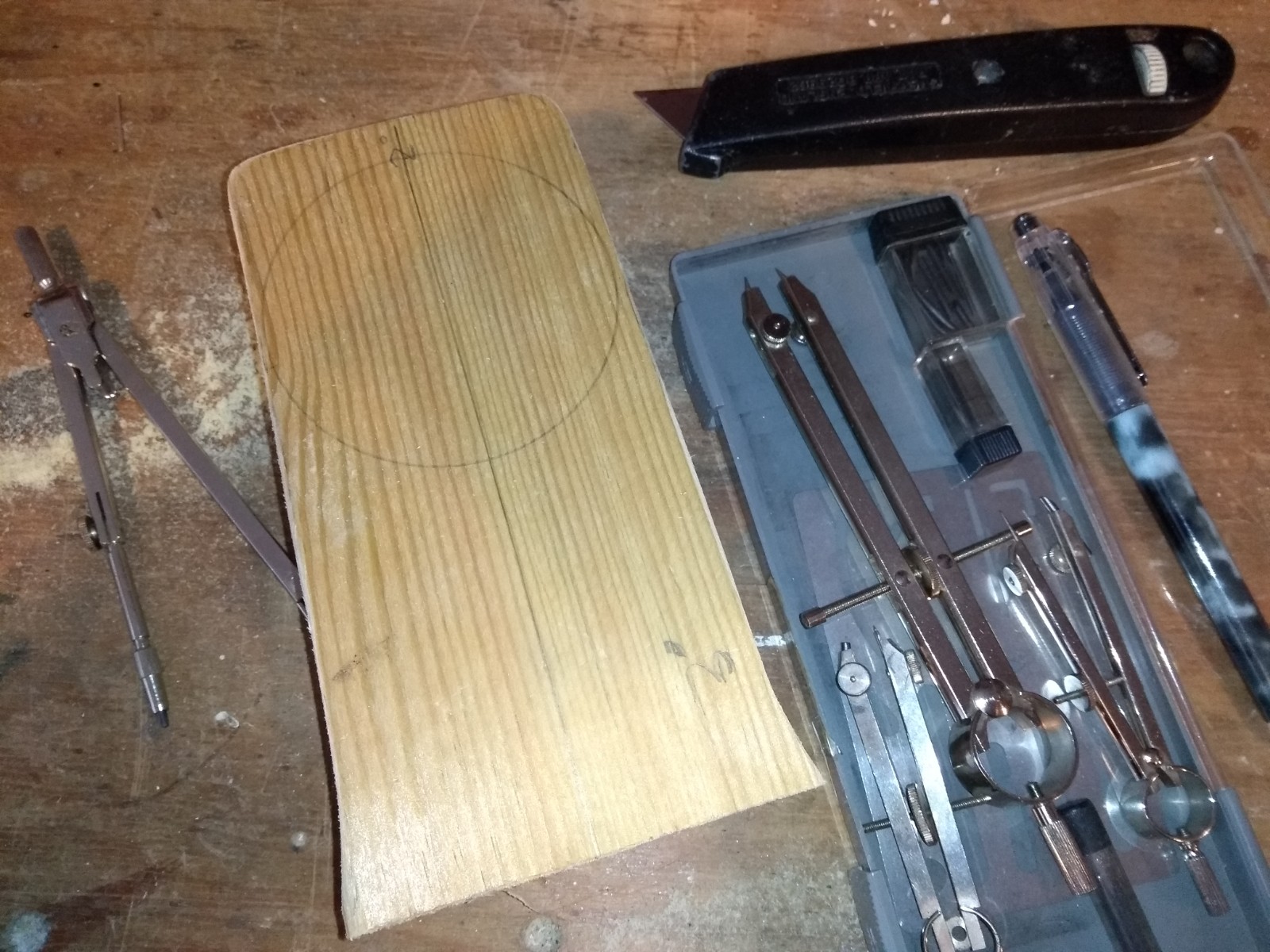 I measured the angle of the chock at 3º using a machinist’s protractor, so I set the bandsaw to this figure and cut round the pencil line. Much to my amazment it fitted perfectly. Next stage is shown in the picture above – mark out a 70mm circle for the mast for cutting on the bandsaw.