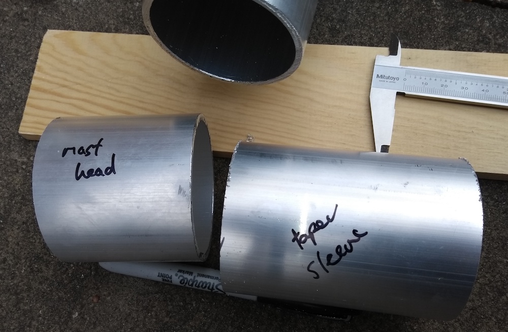 The topmast tube needs to be extended a bit for the mast head fitting. The length for the stress calculations remains the same – 5.6m – but the overall length is a bit longer to allow for the masthead bung and the loops for the masthead blocks