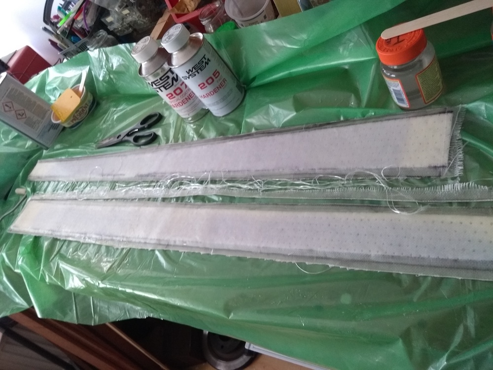 One light way to increase the strength of the deck is to box-in the wave deflector, to make it a closed beam. I’ve made up some fibreglass/coremat/epoxy strips to bond on: