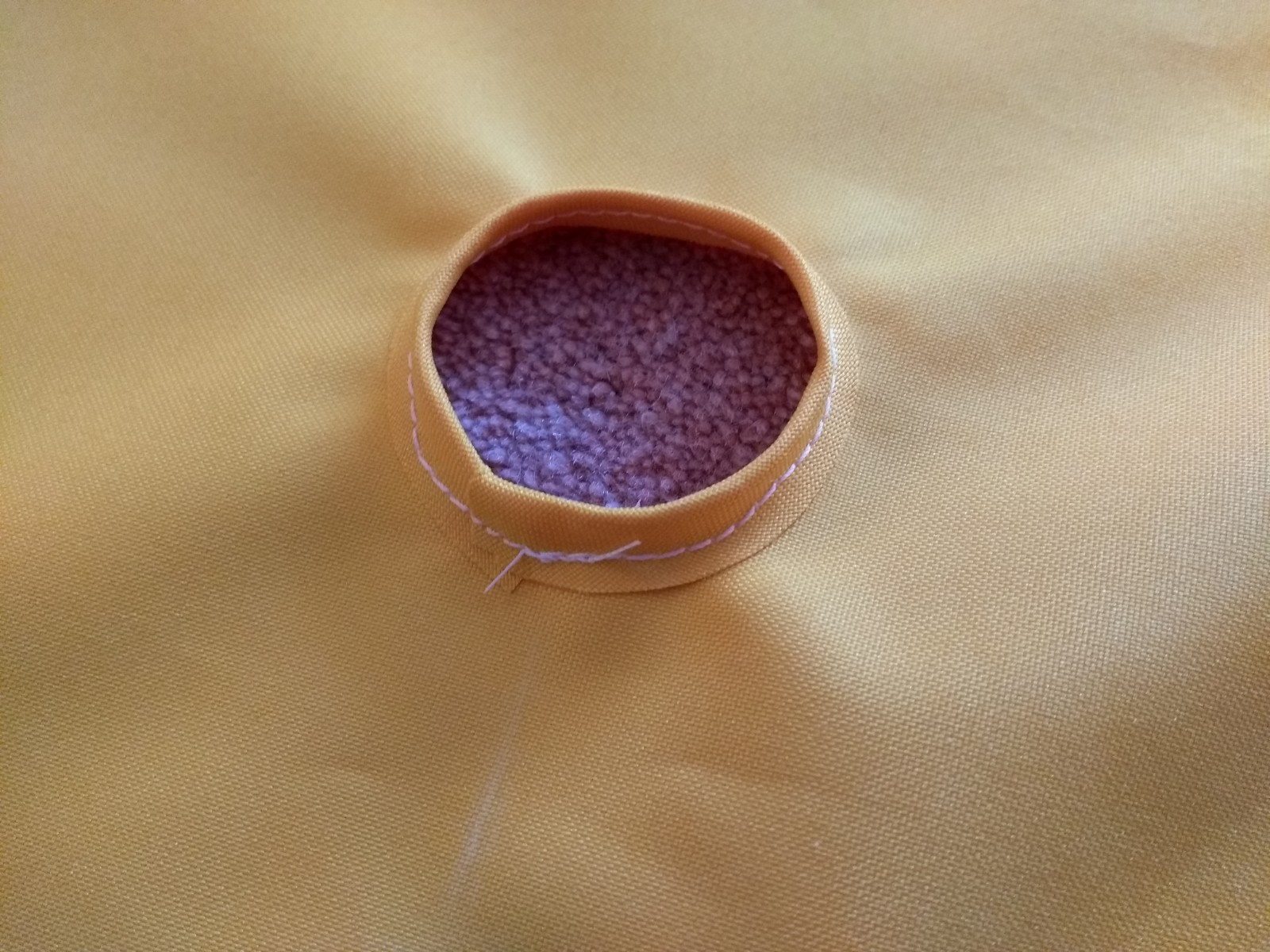 I tried using edging tape but this was far too rigid to go round the hole. So I cut a scrap of batten pocket fabric on the bias (diagonally) to make it really stretchy, and it went round the hole easily. Looks nice too. The sling around the yard will be rope this time as it fits the batten pocket and the halyard block better.