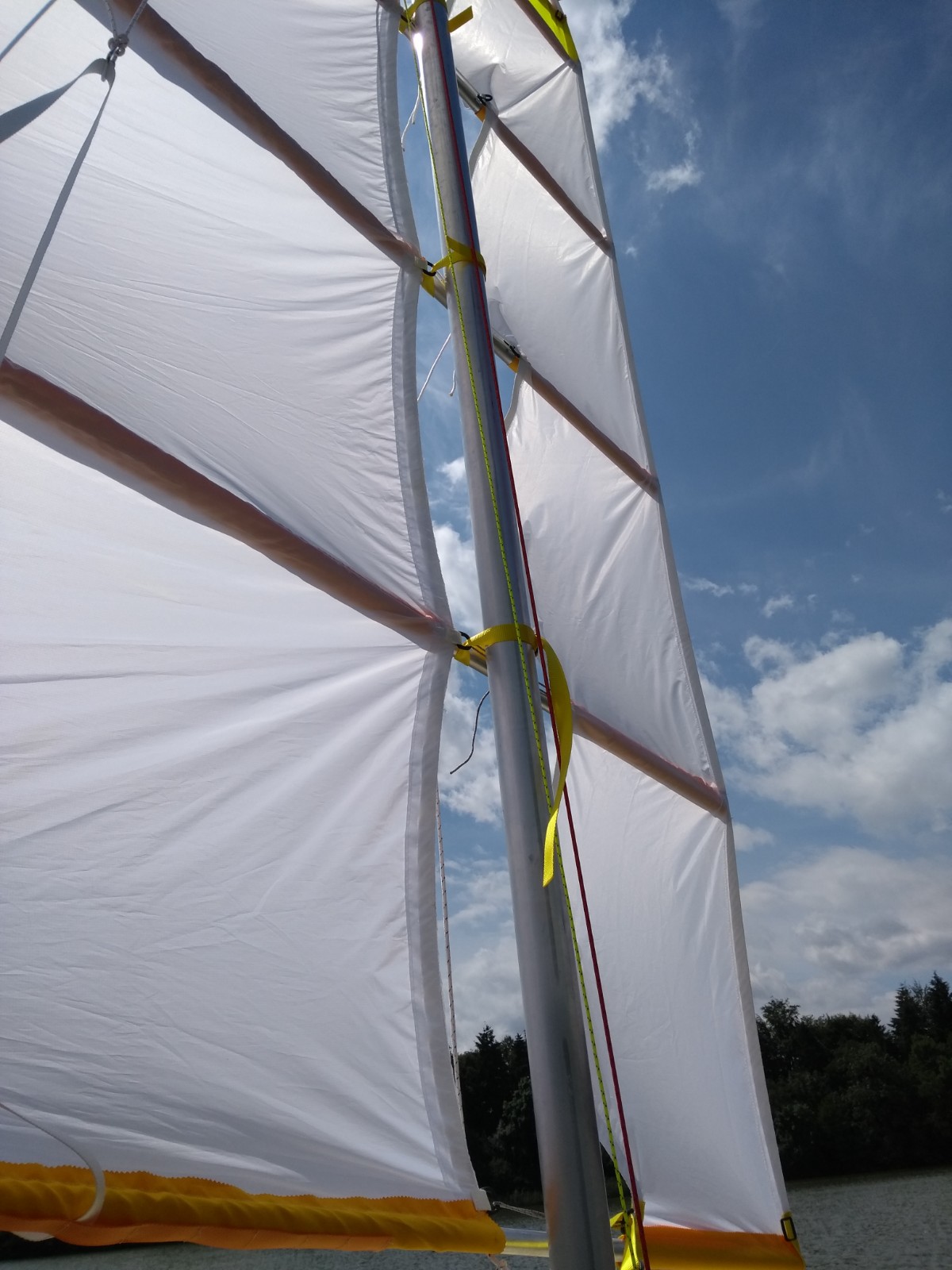- Ultra-short batten parrels. These are looped through plastic D-rings on the mainlet luff and go diagonally around the joint between the batten and mast. Very crude but seem to work ok. If too tight they stop the sail dropping properly. Using slippery polyester tape probably helps.