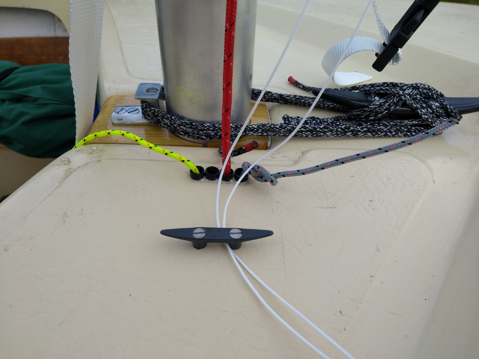 The anchor is a Guardian – a cheaper version of the aluminium Fortress. It was bought for a 21′ 1100kg boat so is a bit oversized for the Wanderer. However it is very light and I own it so that’s what I’m using. I use old climbing rope for the warp as (a) I’ve got 300′ of it and (b) it is very stretchy. The mount works nicely. I didn’t get the shank mount in quite the right place but it fits ok.