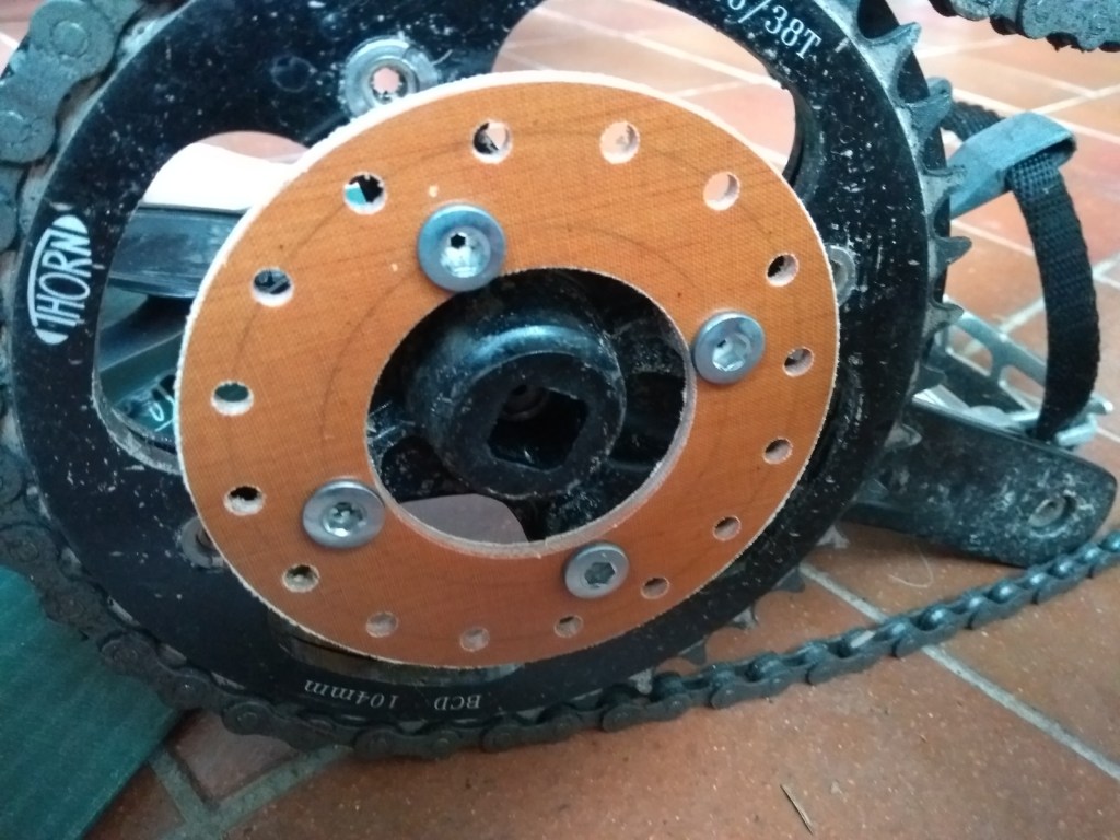 The rotor bolts onto the drillings for the inner chainring. Most bikes will either have an inner chainring fitted or (for a tandem) a simple crank arm. The triplet tandem is probably unique here. I’m not sure if it makes any difference but I did make sure that the magnets are the same way round as the original rotor.