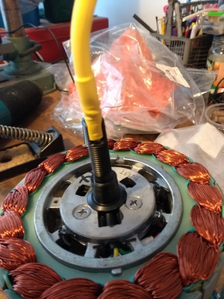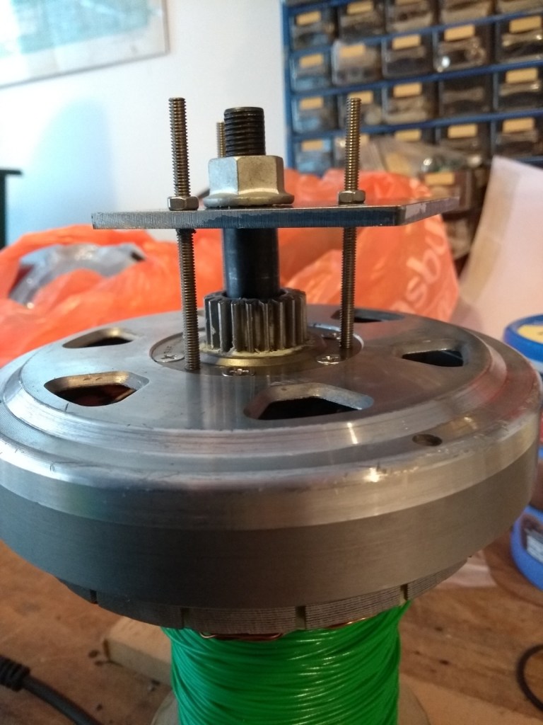 The next step was refitting the stator to the motor casing. I hadn’t thought about this much, but it soon proved tricky as the magnets pull the stator to one side making it hard to get the bearings aligned. I also realised (a bit slow but not too late) that if they did align the magnets would pull everything together fast enough to break something – either the motor or my fingers!