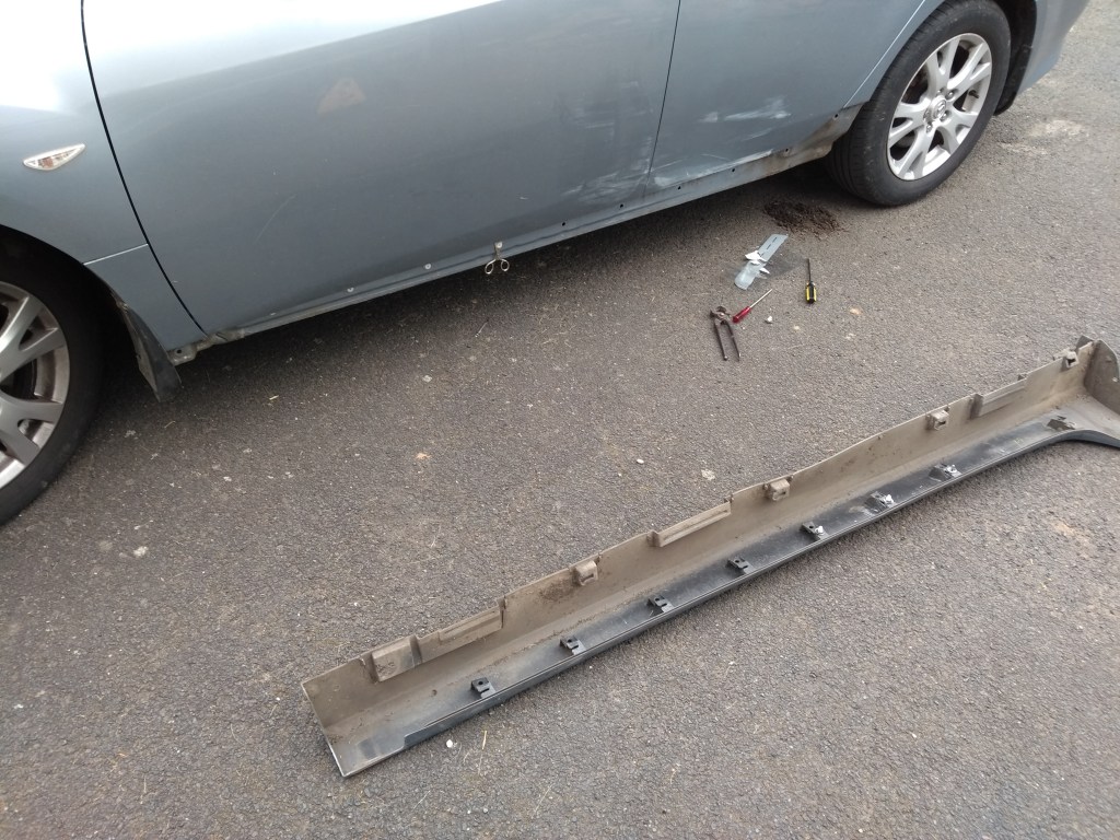 First step was figure just how to refix it. The trim is held on with plastic clips and these were (mostly) still in the car body panels. Some had been left in the car-park so more were going to be needed. On first glance it looks impossible to put it back on as the clips need to slide into the plastic sill in different directions, but eventually I figured out that if you take the clips out of the car and put them into the sill it becomes easy – the side is tapped into position first, then the bottom clips swing up into the bottom of the metal sill.