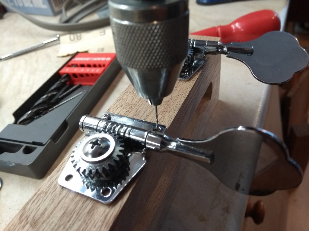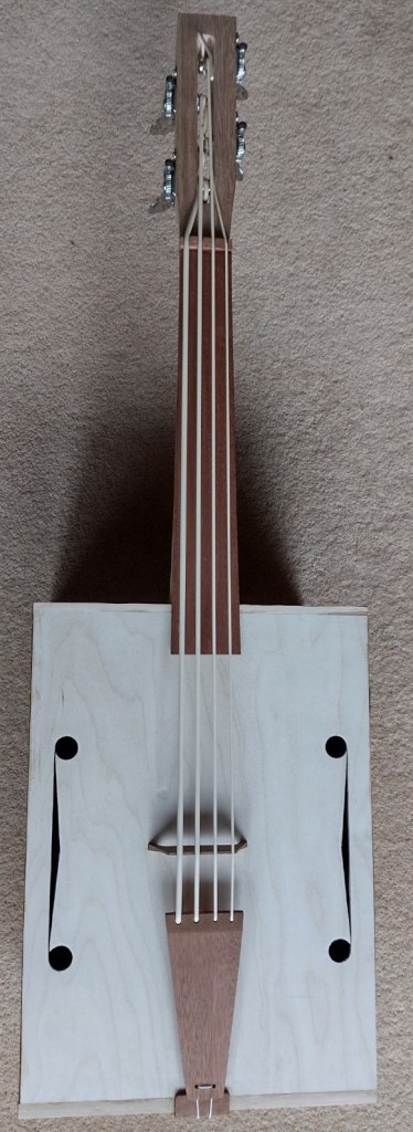 The neck is more-or-less finished. I’ve fitted the tuners (drilled out to take the larger strings) so that I could see what it all sounded like. The answer is that it sounds lovely 🙂