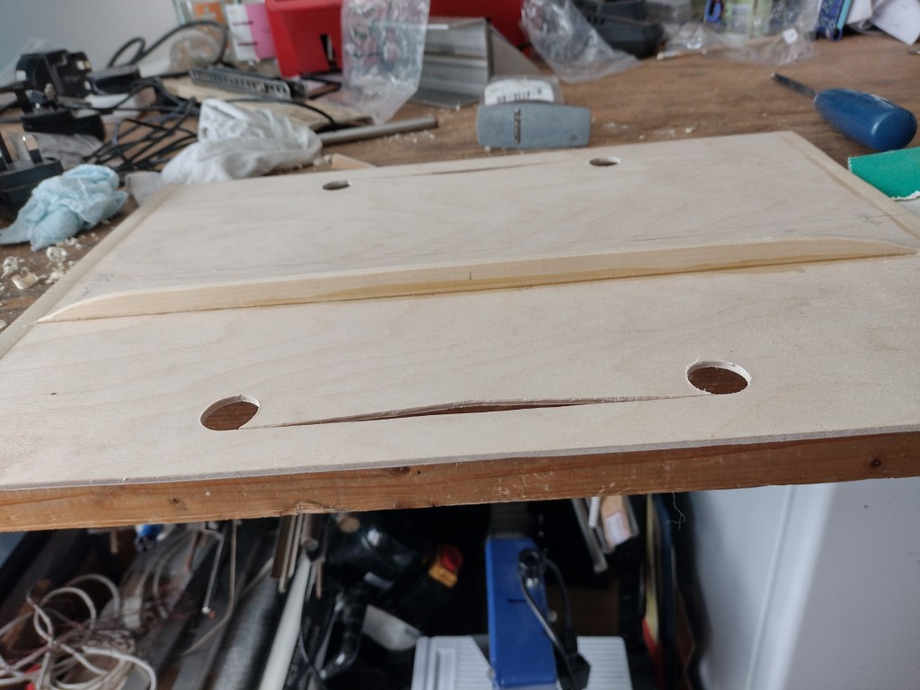 - Maximum flexibility of the maximum area of the soundboard i.e. the holes needed to be close to the edge and fairly long – just over 1/3 of the length of the soundboard