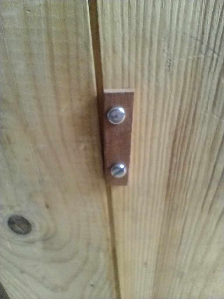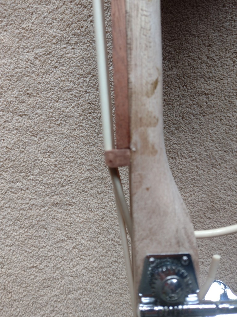 The soundpost is vital to provide ‘life’ to the soundboard. The soundpost is a bit of bamboo – I think it was a skewer or pot-plant support – chosen as it has very straight grain. It is about 5.5mm in diameter. Since the wine box is very deep and the ‘f’ holes are a long way from the soundpost location I didn’t think it was feasible to use the normal approach of wedging the post in by feeding it through the f-hole attached to a spike. Instead I drilled a hole in the back of the wine box and pushed it through. The hole is covered with a screwed-on plate to take the load. I cut the post to put the top under tension – a few mm longer than the zero-tension length.