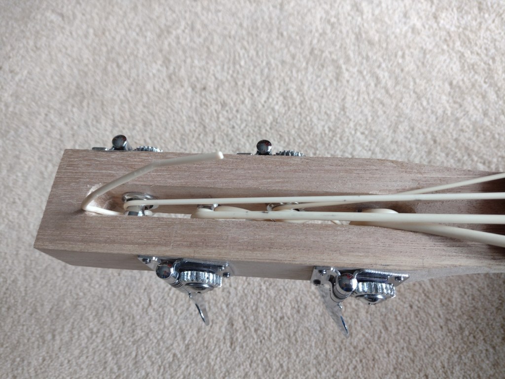 I like the design of the headstock – it is reminiscent of a double bass – and overall works well. There is a slight problem with the angle of the centre two strings over the nut to the tuners – the angle isn’t big enough to prevent a slight buzz if the strings are plucked vertically i.e. down towards the soundboard. I could add something to hold the strings down if this becomes a problem, but the buzz is so slight I’m not worried for now. A better fix would be to increase the headstock angle by scarfing the headstock to the neck.