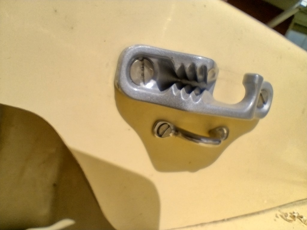 The rope through the scuppers is held by a cleat directly attached to the plate. The traveller cleat and bungy loop screws go through the boat into tapped holes in the plate. Nice and neat, largely invisible, strong and no sharp points to make holes in hands or ropes. I used Tefgel to avoid corrosion between the stainless screws and the aluminium.