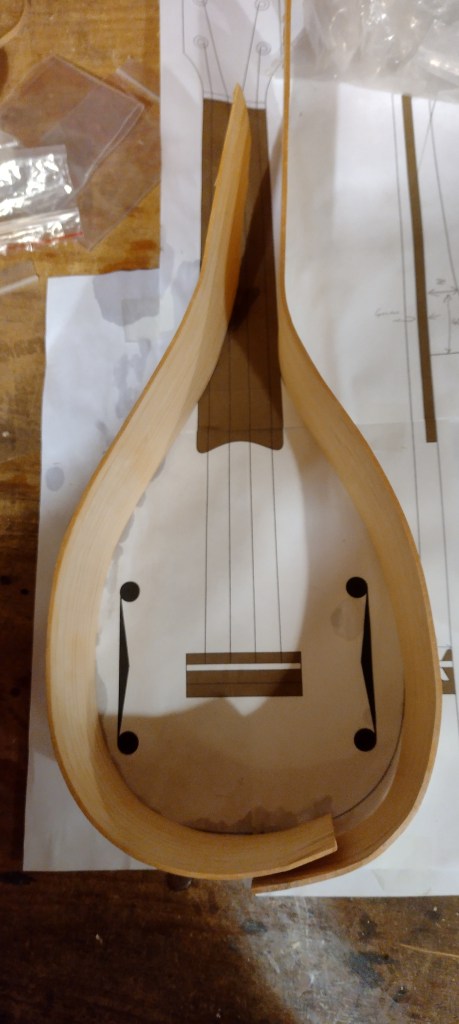 I cut two more strips on the bandsaw and thinned them down. They were slightly too narrow to use for the bottom of the uke so I used them for the sides. Thinning the sides takes a while but gets there in the end. I’m aiming for 2mm thick.