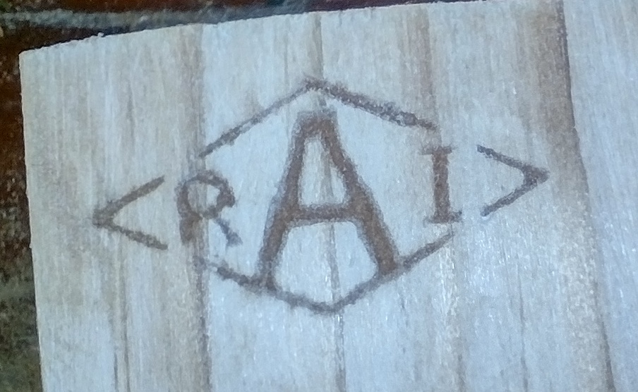 I also experimented with ‘inlay’. I glued the logo onto a spare piece of wood and cut away the logo with a scalpel. I filled the gaps with glue plus darker wood powder and got this: