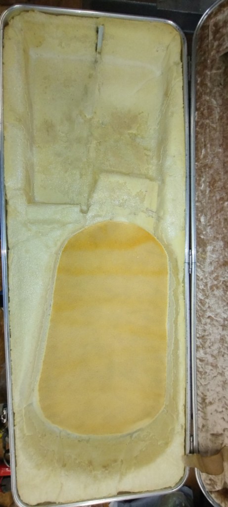So I got the job of relining the case. The fabric appears to have been fitted to a mold, with foam injected behind the fabric. The foam and fabric was presumably then fitted into the plastic case.