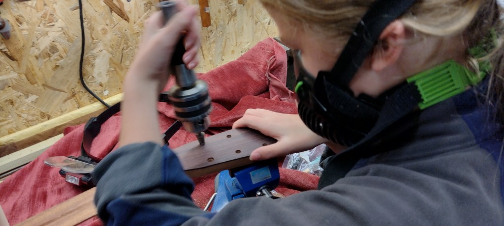 We had to enlarge the holes in the peghead to take the machine heads. This is properly done with a tapered reamer. I bought a StewMac reamer for the pegs that hold the strings to the bridge and started enlarging the holes with that, but it wasn’t big enough to finish the job.