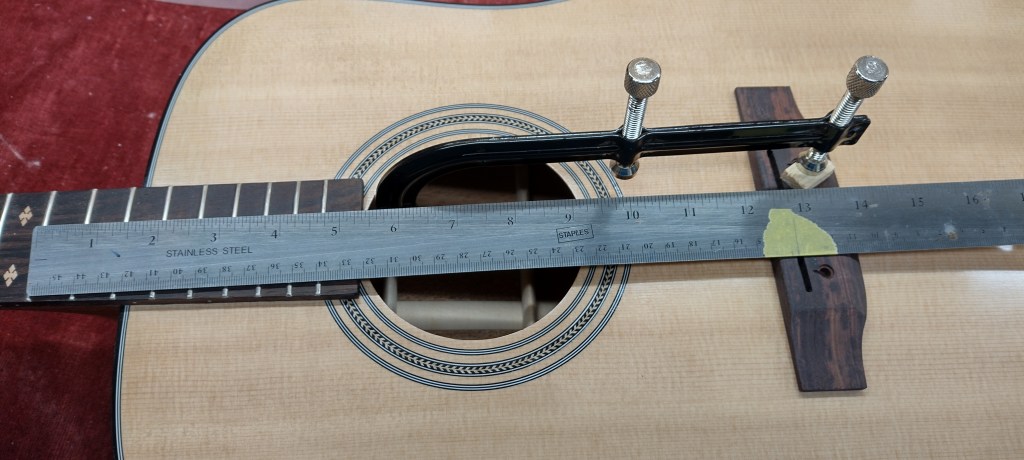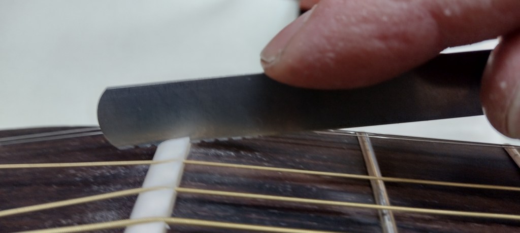 It is necessary to work on both the nut and saddle height to avoid over-lowering one end. I got the action to the figures specified in the StewMac instructions and it seems to work well. I didn’t have any fret buzzing to sort out.