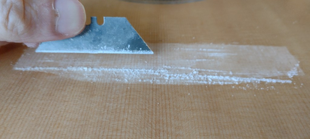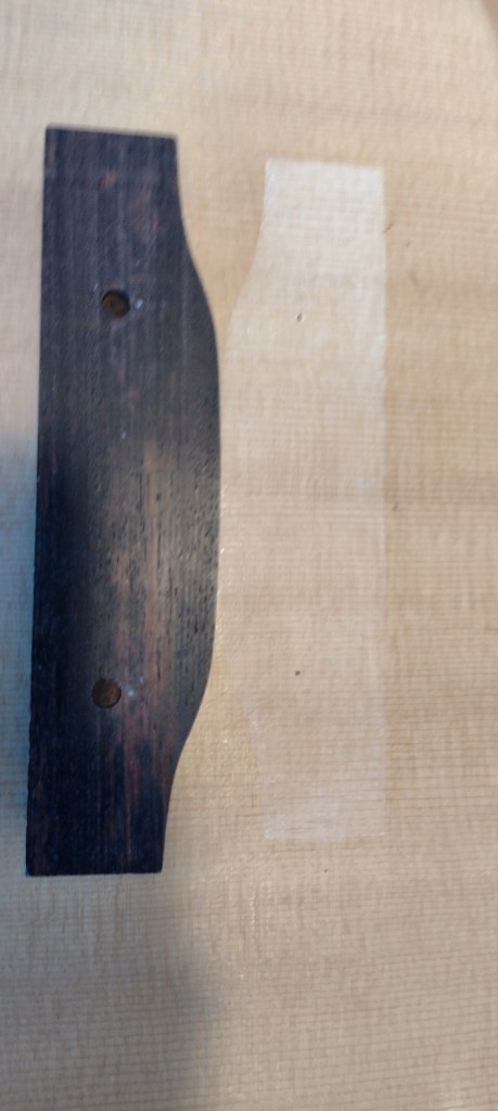 Once the bridge is located I drew round it with a scalpel to just cut through the finish – not the top. The finish inside the line must then be removed to provide a good gluing surface.