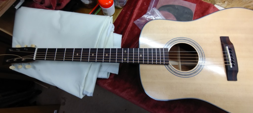 - Finishing the guitar took a while, mostly because I’ve never done French Polishing before. By the end I’d figured out how to make it work – at least in a cold UK winter workshop. It would probably need to be a different technique in warmer weather. I still need to figure out how to fill the grain properly.
