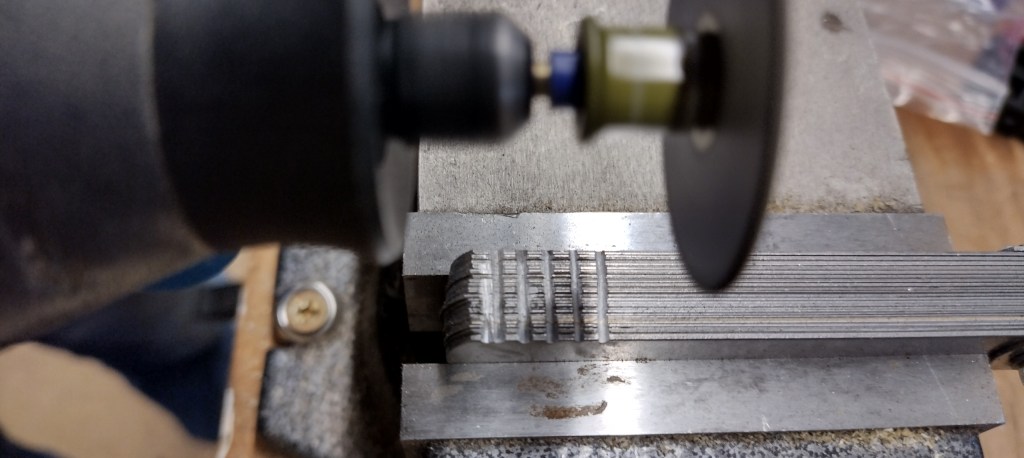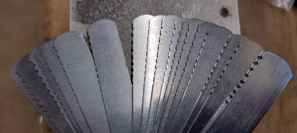 I needed a set of files for the nut. These are expensive to buy but easy to make. A cheap set of feeler gauges is the starting point. Use a small thin grinding wheel to cut slots at the edge across all the gauges.