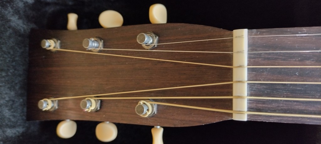 I screwed up the first set of strings – didn’t get them on the tuners right. I bought another set of strings (Martin Extra Light) and watched a video on tying them to the tuners and got it right the second time.
