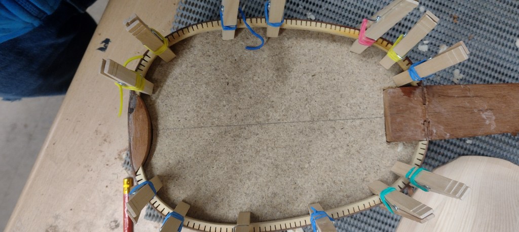 With my simple mould I could only do the top kerfing before removing the mould. However it all went smoothly. Note the bottom block – this is necessary to take the end pin for attaching the tail piece as this is an archtop – the strings are attached to the tailpiece rather than the bridge.