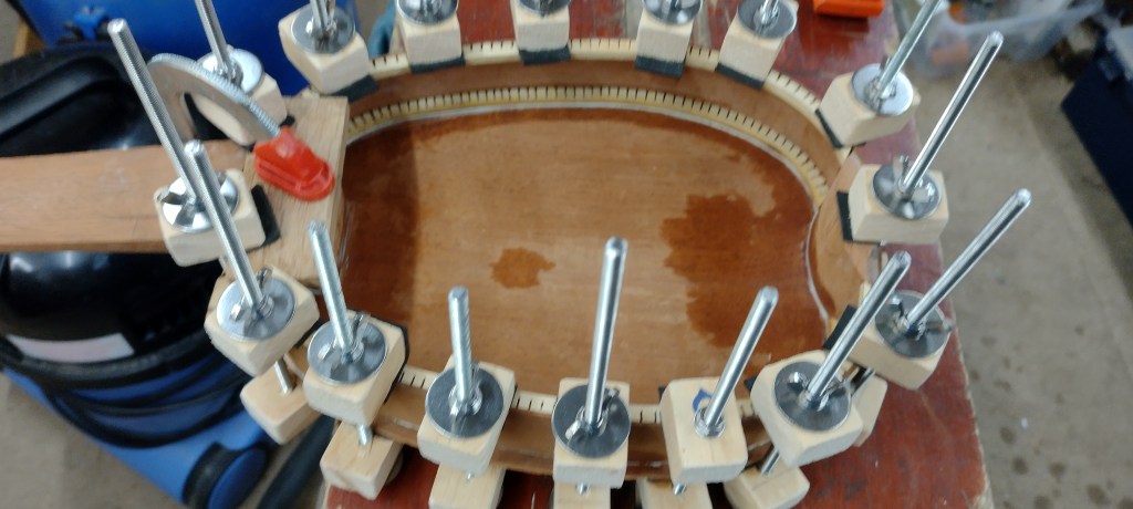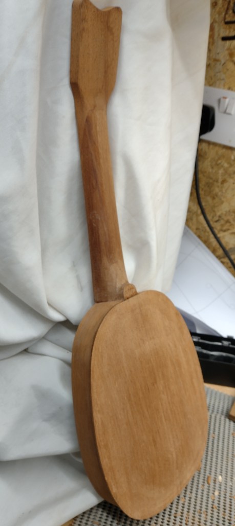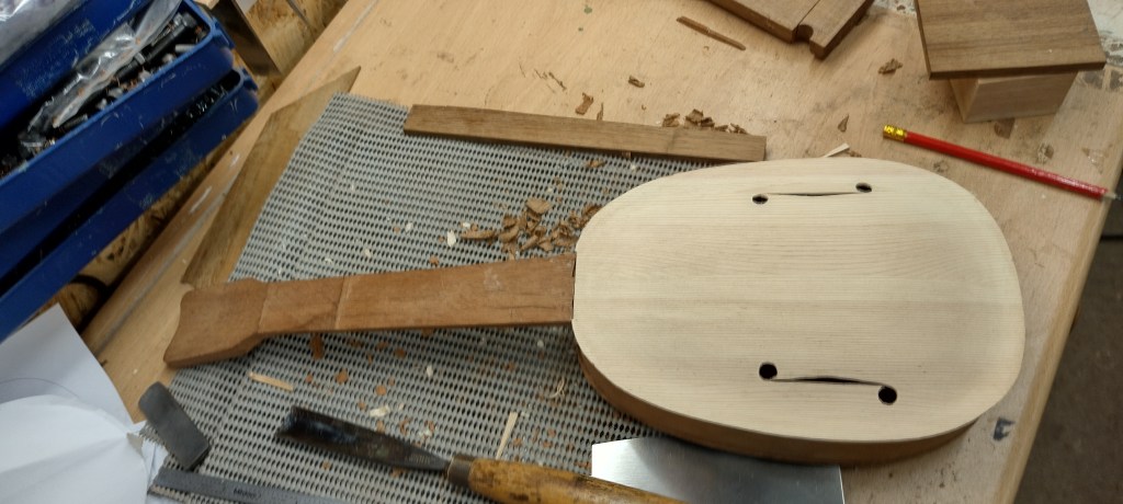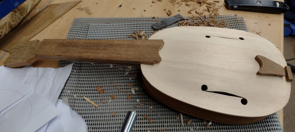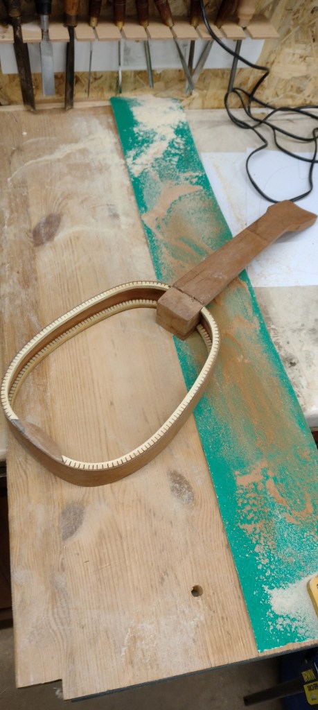 Lots of progress on this project recently. The sides have been glued into the slots into the neck.