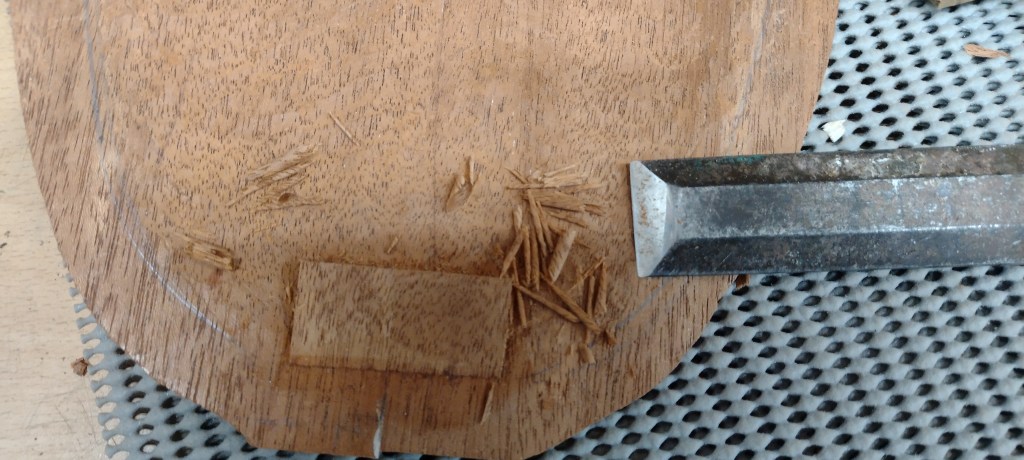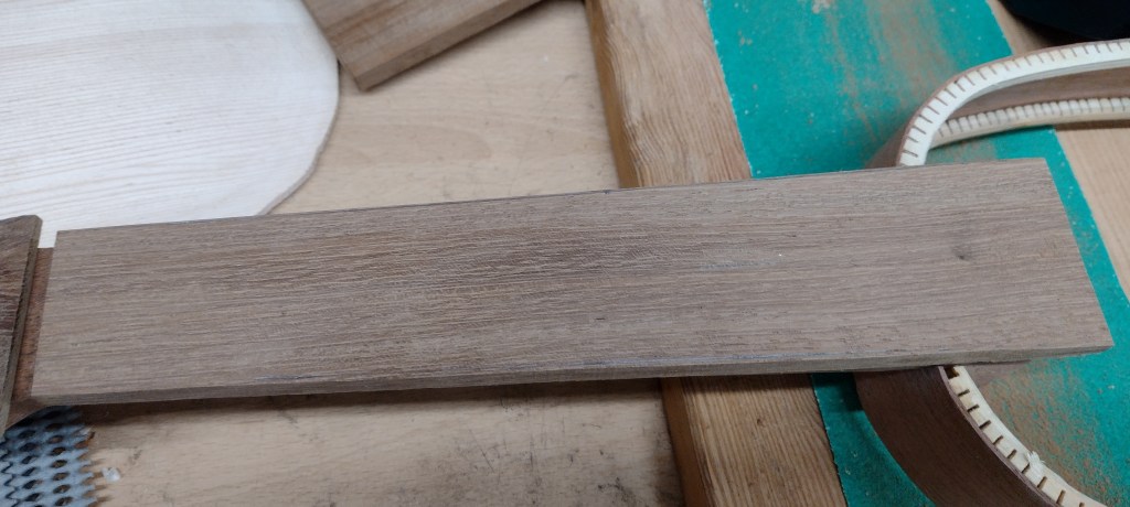 I have cut some Iroko for the peghead veneer, fretboard and tailpiece. I’ve chosen Iroko as (a) it is hard wearing (b) looks nice when oiled (c) has good acoustic properties (d) I’ve got lots of it left over from kitchen worksurfaces. It is reclaimed wood – it was originally school chemistry lab worktops complete with graffiti, burn marks and chewing gum.