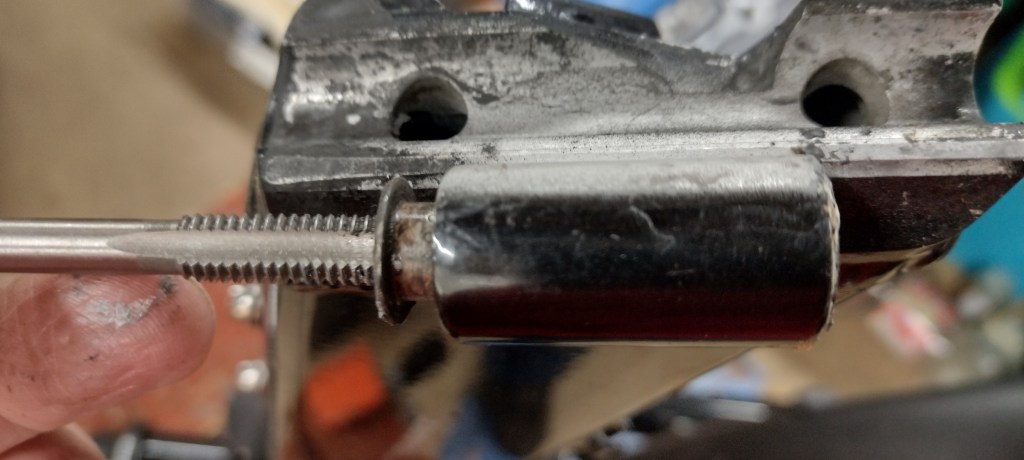 Getting the bushings out is the big problem. The inner bushings pulled out by inserting an 8mm tap and pulling – this is probably where the wear is – around the bushings in the frame rather than the pin. Anyway, easy.