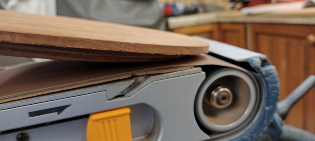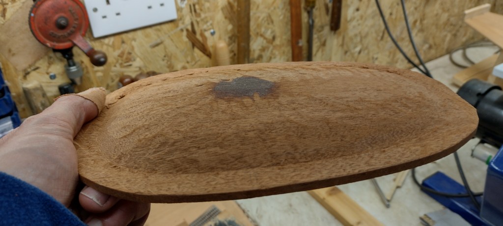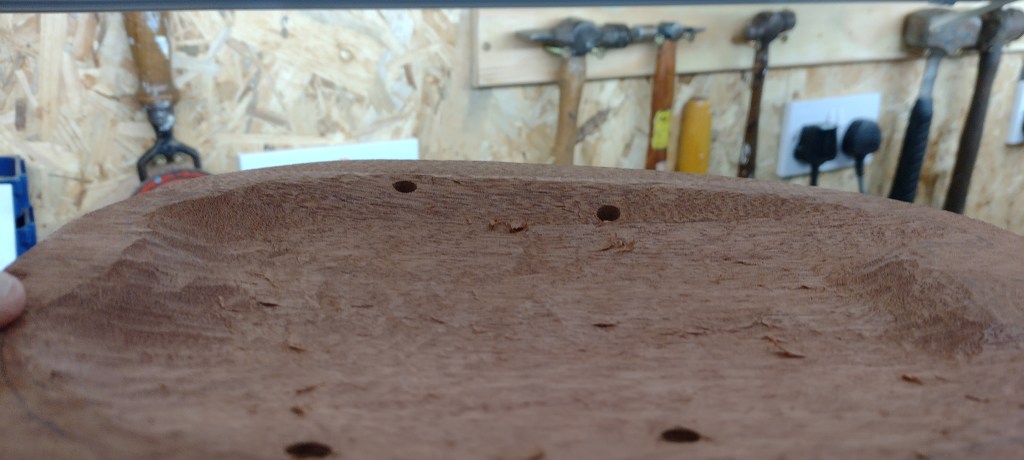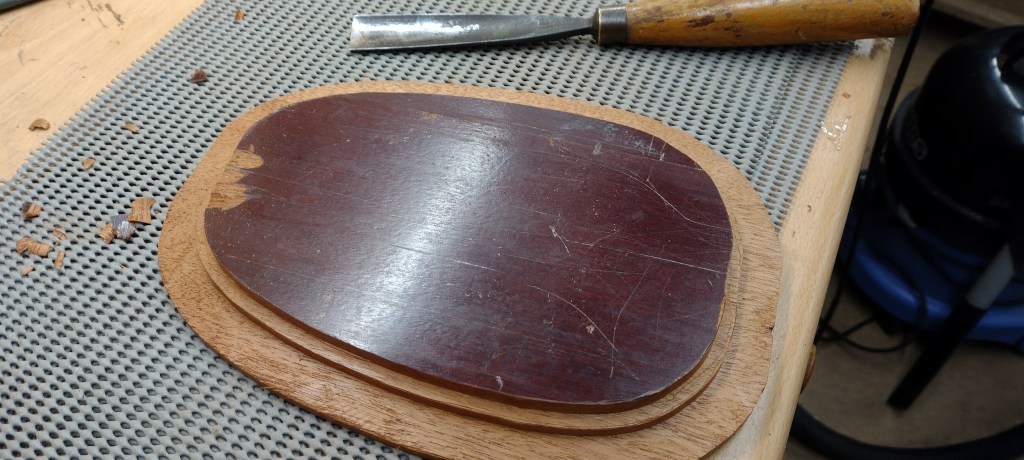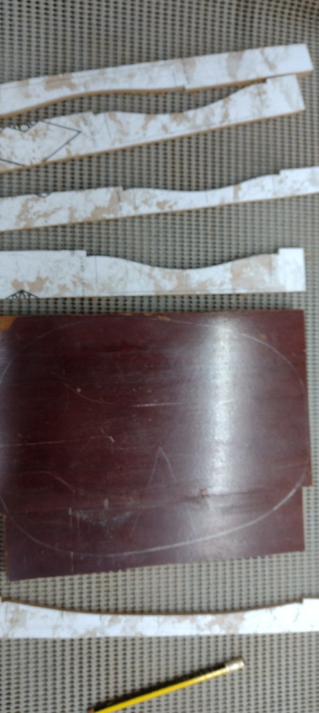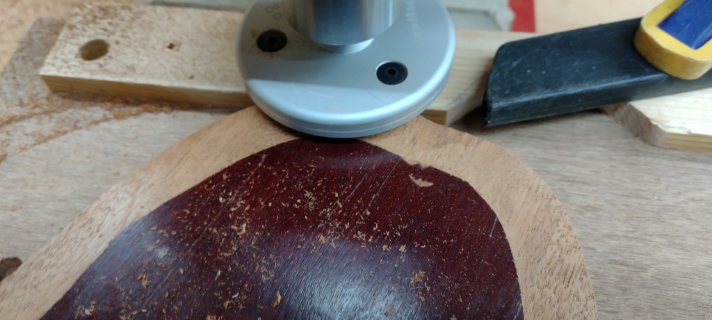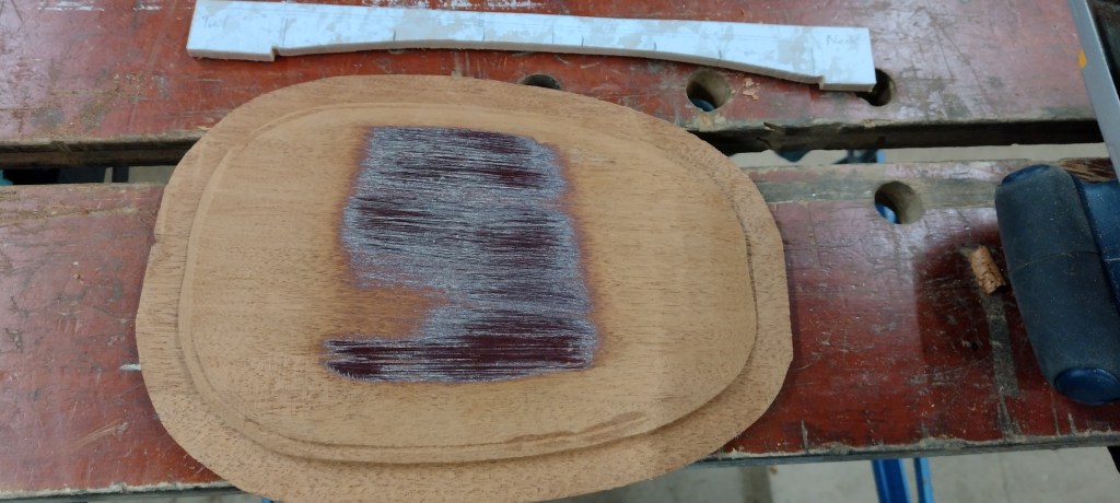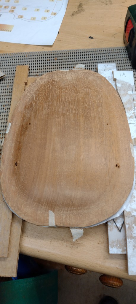 I came to the conclusion that it wasn’t worth using the existing soundboard – it just doesn’t ring nicely. So I tapped all my lumps of wood to find one with a decent sound. The best was some mahongany.