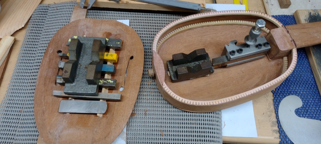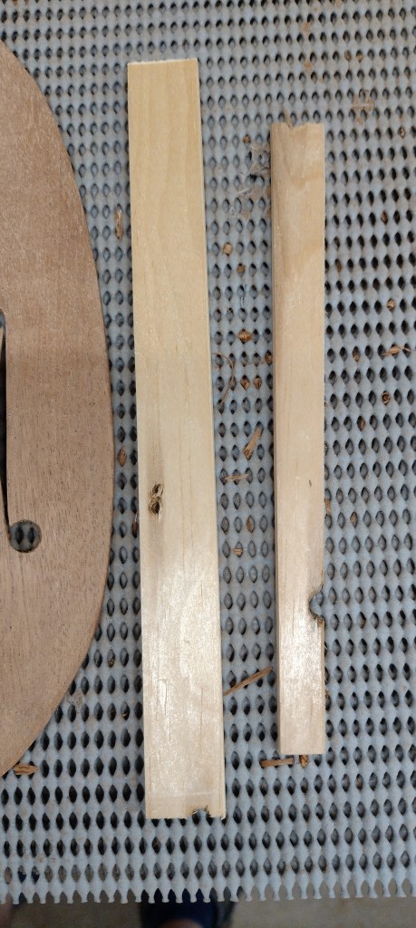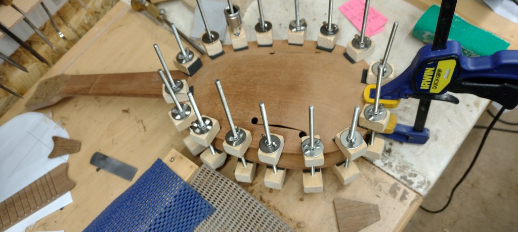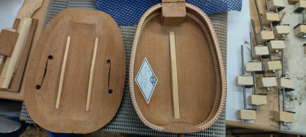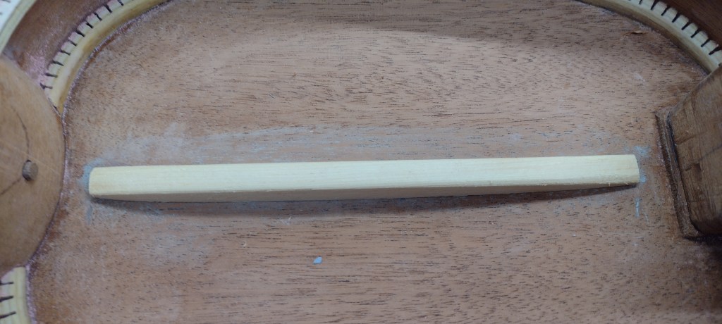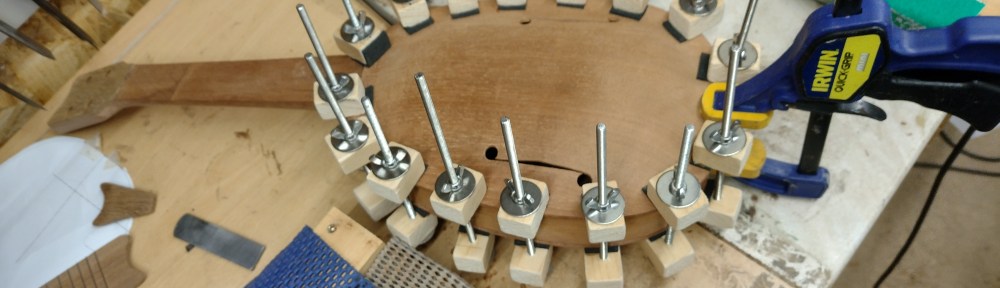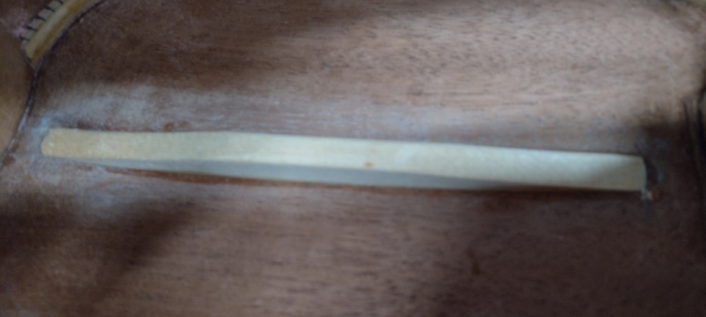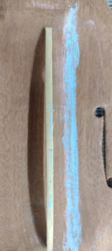 Trimming the f-holesBrace material. This is from an old cupboard and has a lovely tone. I think it is yellow cedar.Fitting the brace with chalkI braced the back as it is far too thin in the middle. Really I should make a new back but that isn’t going to happen – at least until I find out whether the sound is basically ok.Gluing the braces on with a collection of lumps of metalShaping back braceShaping top braces. They are 11.5mm high in the middle and around 5mm thick.Ready to glue the top onGluing…