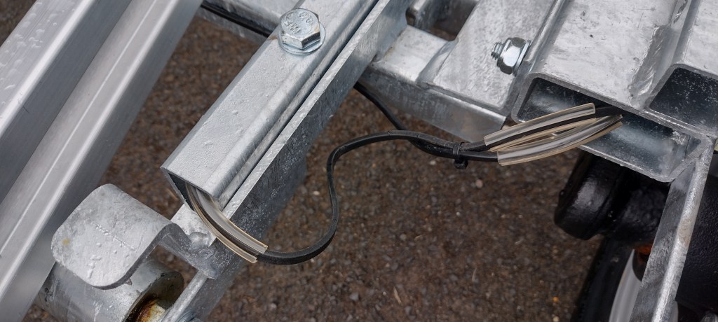 The road base has a couple of lights fitted to the front of the mudguards. The wiring for these runs inside the tubes of the trailer, and the ends of the tubes were very rough and sharp – lots of burrs and sharp edges. I filed these down the best I could and fitted chaffing tubes around the wires – I don’t want blown fuses in the car when towing.