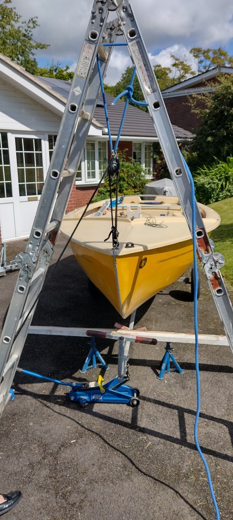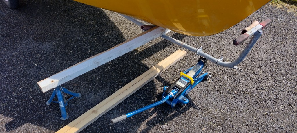This is easy if near water. On land with 120kg of boat it is rather harder. Lots of thinking was done.