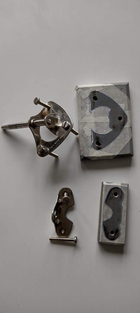 Having (finally) cleaned the back of the boat for gluing the pintles on, I took the opportunity to get a name badge made up. This was done by CDP Printing in Telford – highly recommended. Allan did a lot of work to help me get this right for a very low price job.