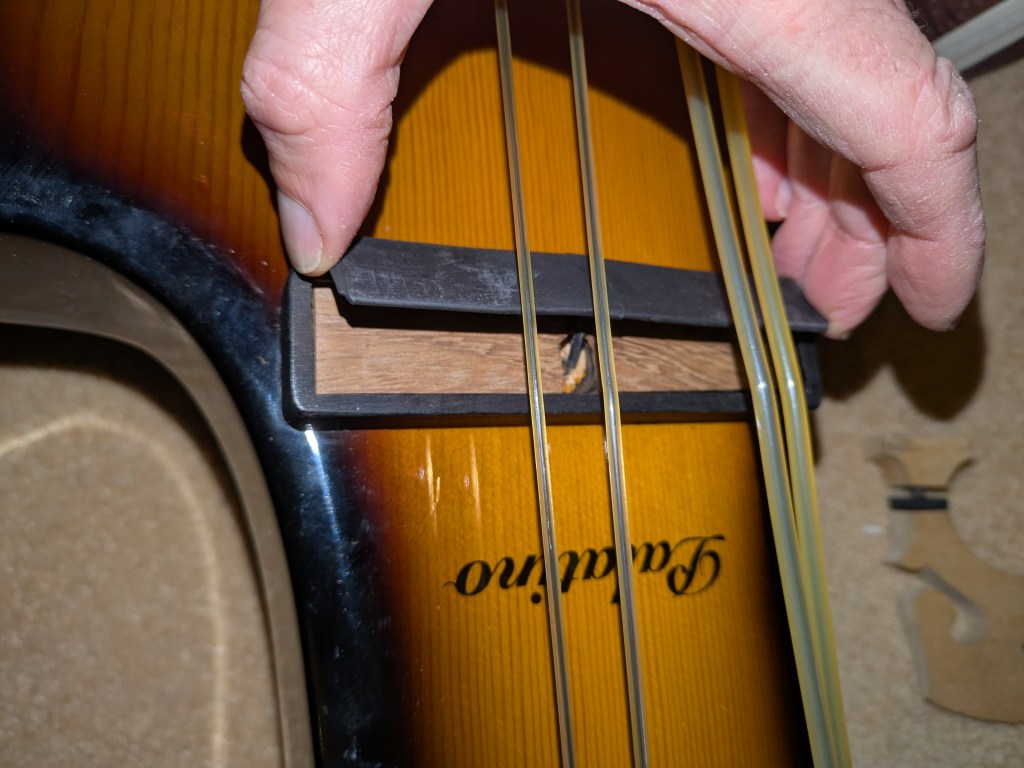The top of the bridge is rather flat. This makes it good for pizzicato (plucking the string) but is harder to bow. Since I want to use the bow I’ll need to reshape the top of the bridge to have an arc. I’ve got Henry Strobel’s book with the shapes required. I might try to buy another bridge (it isn’t a standard size) or make one rather than alter the original bridge.