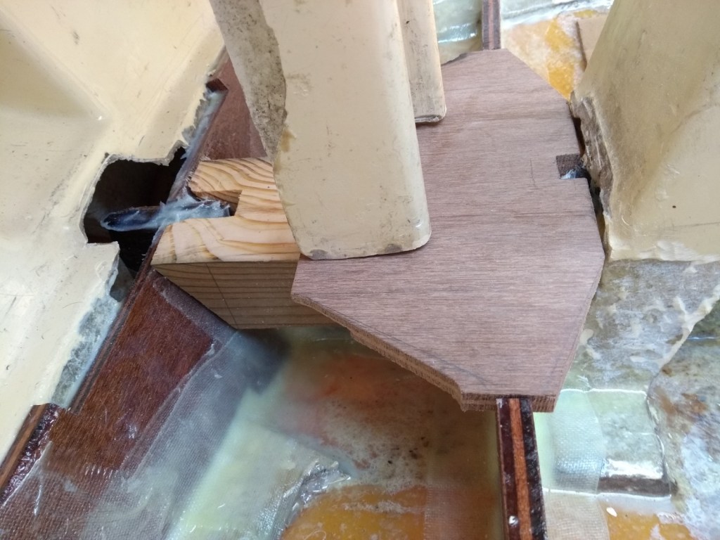 • A big block cut from a fench post – possibly Larch. This provides somewhere for the screws to go and takes the vertical force into the old plywood hog (which I cut a section out of).