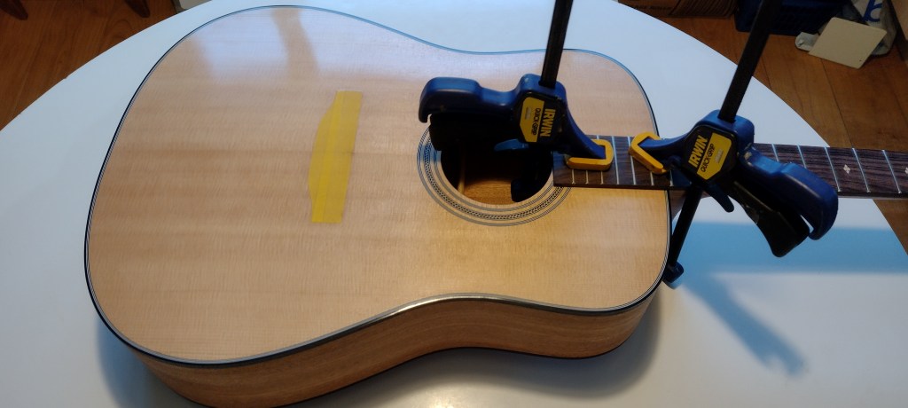 This went on easily enough. I didn’t bother with cauls – there didn’t seem to be a need. I did this in the house as the workshop was too cold for the glue to set properly. Note the masking for the bridge – more on this later…